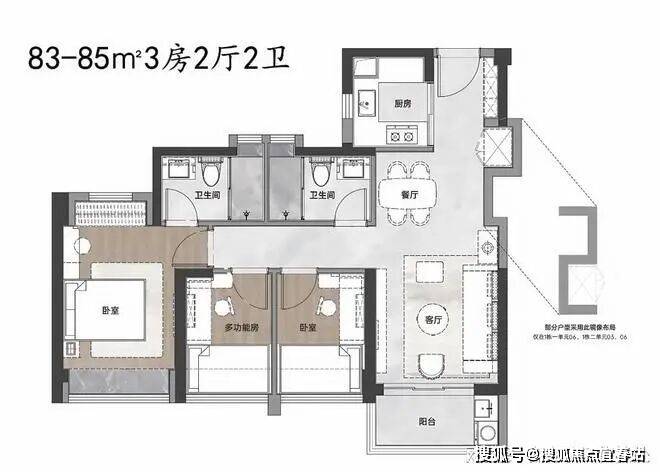 建面约83-85㎡3房2厅2卫,是项目的主力户型。对生活品质有更高追求的朋友,可以首选这个户型。