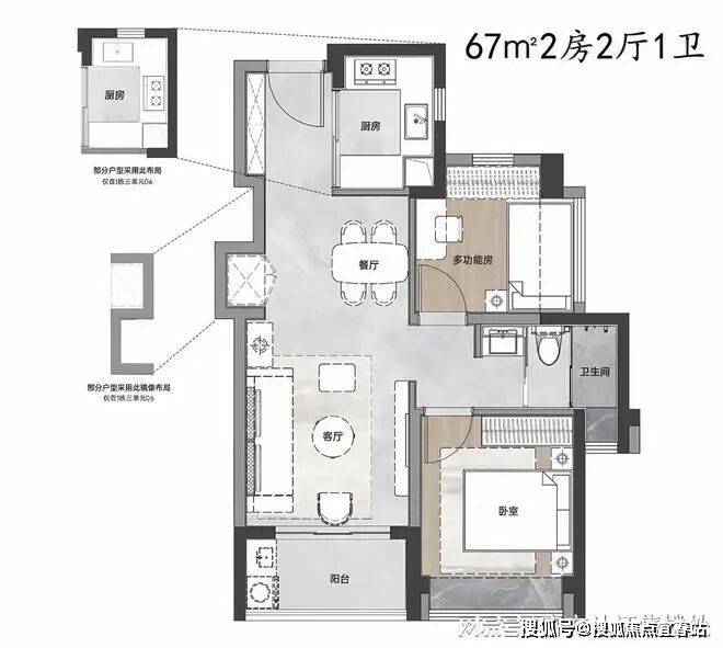建面约67㎡2房2厅1卫客厅开间达约3.2米,东南朝向,通风采光好。客餐厅一体化设计,直通阳台,大大提高户型的空间感。
