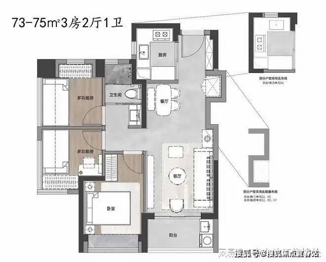 建面约73-75㎡3房2厅1卫,是项目很受欢迎的户型。这款户型最大的亮点就是做出了市面上85平三房的既视感,实用率高,实属难得。