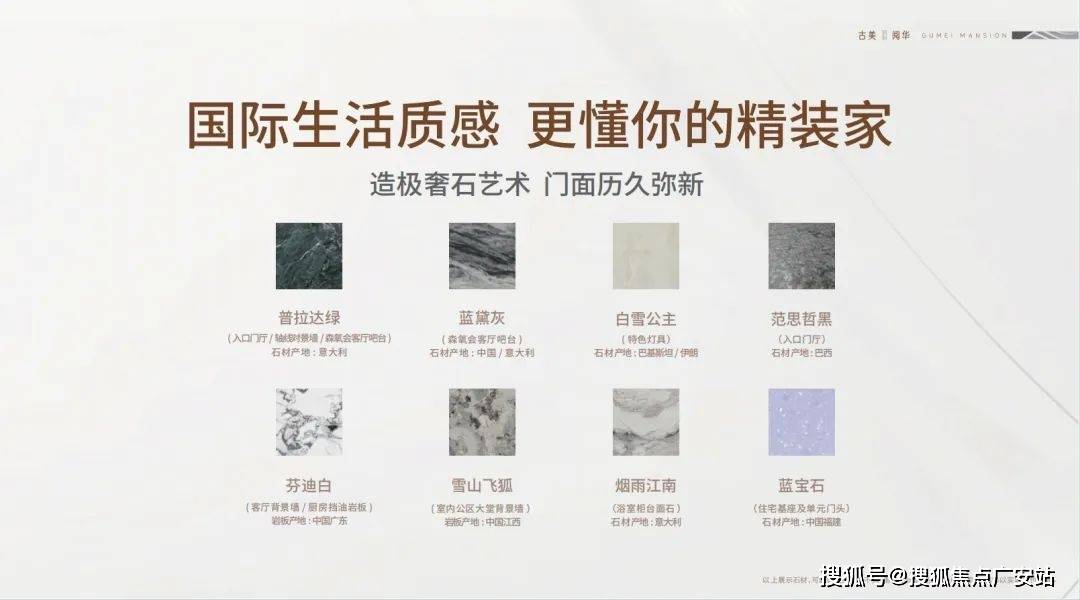 古美阅华在装修上使用大量奢石元素,凸显尊贵的艺术格调比如客厅背景墙、厨房挡油板选用了芬迪白岩板,浴室柜台选用了原产地为意大利的烟雨江南石材。