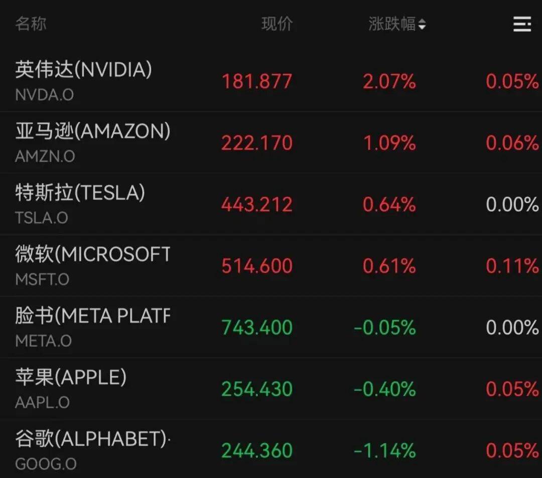 大型科技股涨跌不一,英伟达上涨2.07%,亚马逊上涨1.09%。谷歌下跌1.14%,苹果下跌0.40%。