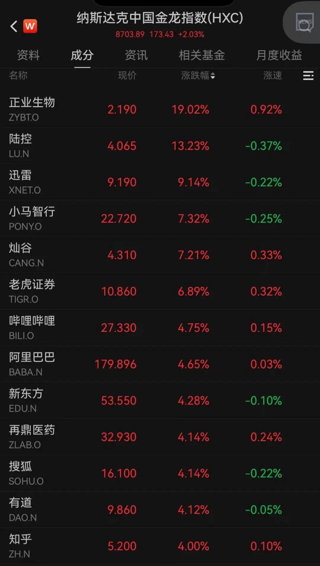 影视股迅雷上涨9.14%,中概互联板块小马智行、哔哩哔哩、阿里巴巴分别上涨7.32%、4.75%、4.65%。