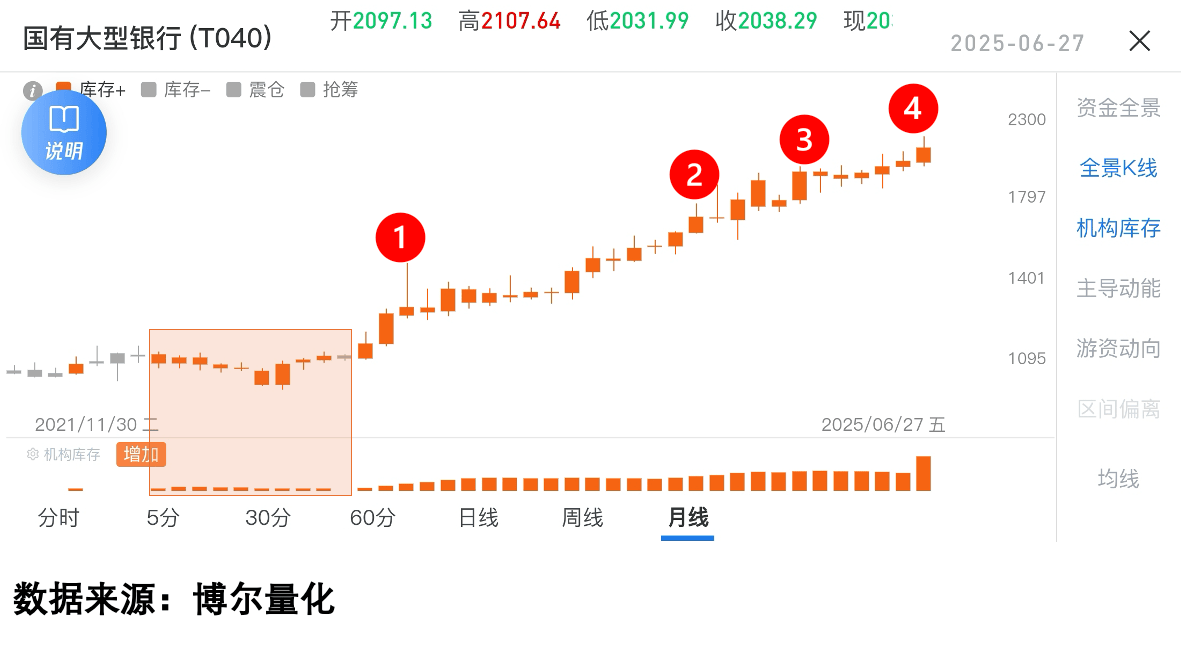 这张图是我用了十几年的量化系统生成的,下面橙色柱子代表机构活跃度。看清楚没?银行股在2022年横盘时,机构早就暗度陈仓了。