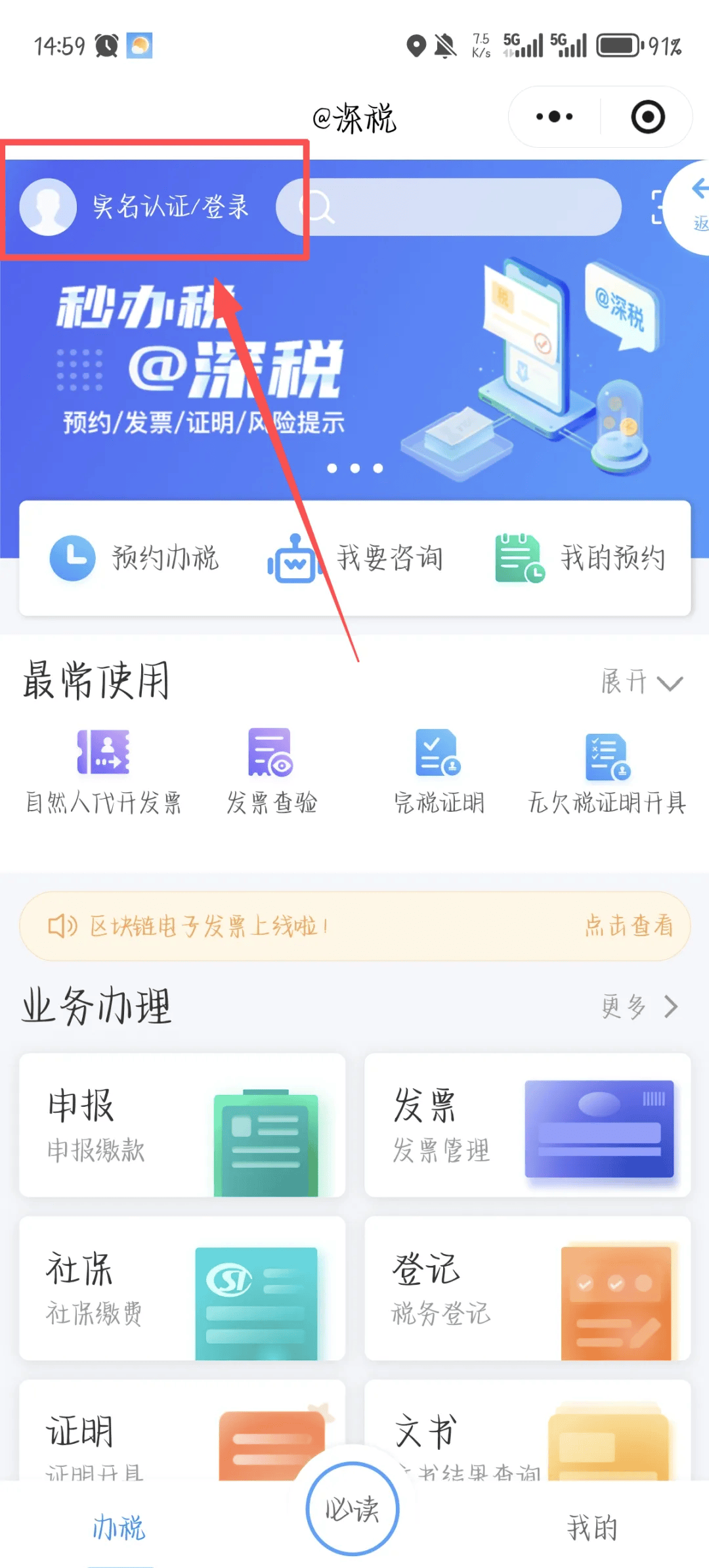 第一步:进入点击“深圳税务,点击“我要办”,然后点击“@深税”,然后进入页面后点击“登录”