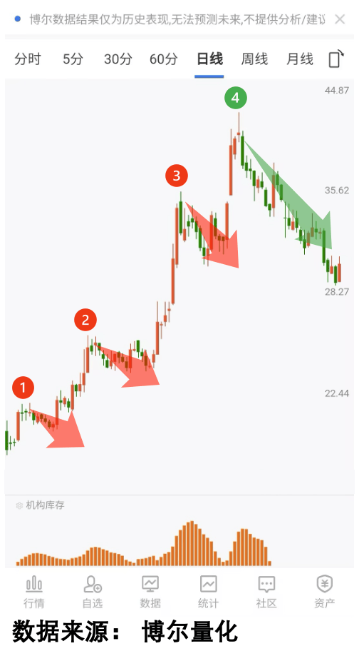 看图1,前三次高位回落时,下面的橙色柱子没断,说明机构还在;第四次断了,机构撤了。