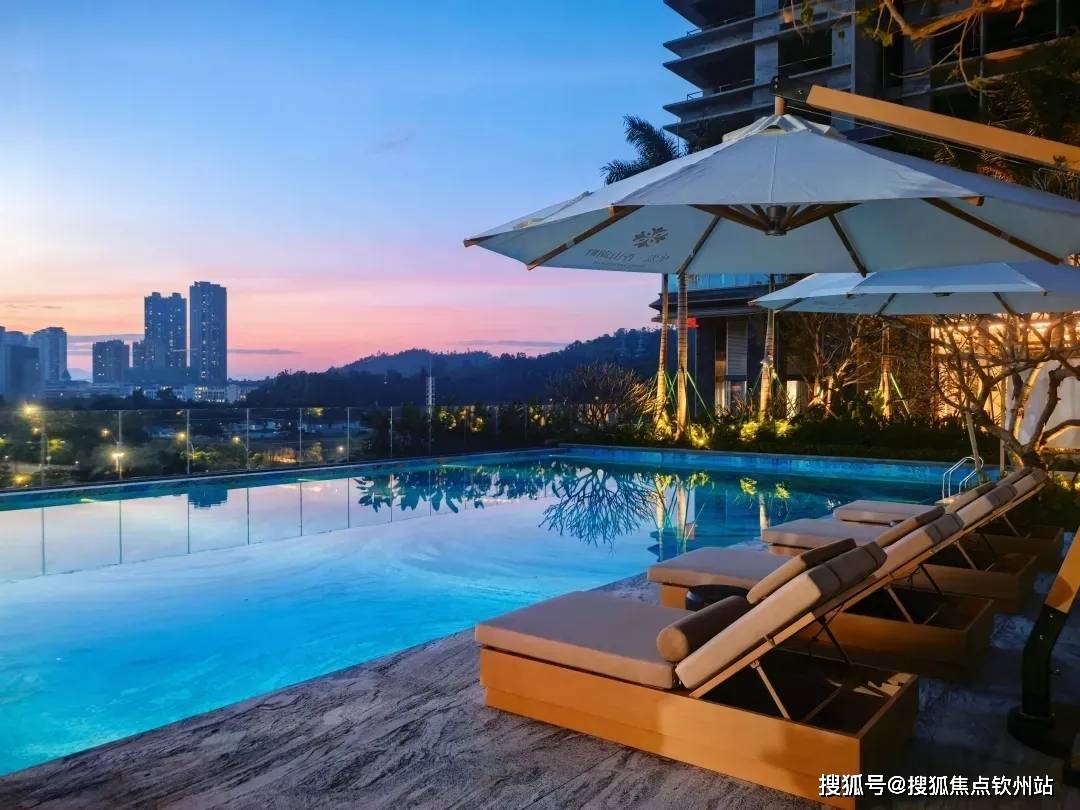 约5000㎡浮岛花园由新加坡顶奢酒店景观团队设计,四季种植紫花风铃木、古桩鸡蛋花等名贵树种,搭配露天恒温无边际泳池(底部镶嵌梵高《星空》马赛克),营造度假式居住体验。