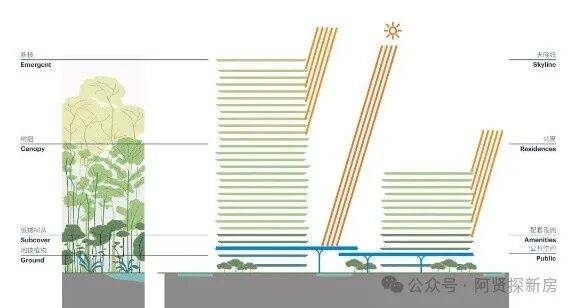临江3栋高层为公寓,另1栋为演艺中心,靠近黄埔大道的2栋,则是公寓与顶奢酒店。其中T1为13层公寓,T2和T3为32层公寓,T4为4层演艺中心,T5和T6则分别是52层和59层商业商务大楼。
