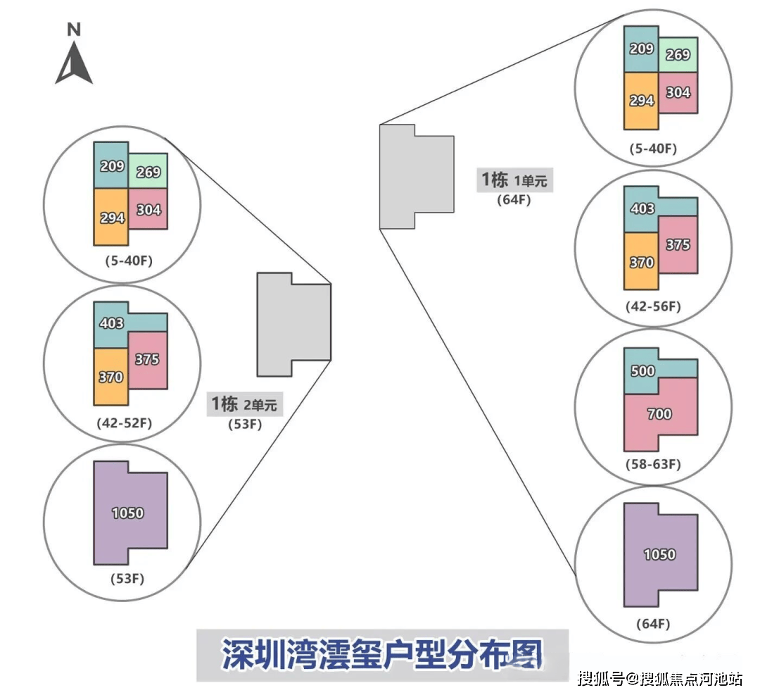 1栋公寓250米,4栋住宅分别150米、200米、200米、240米。层高3.3米,约40-70层(不含底商)