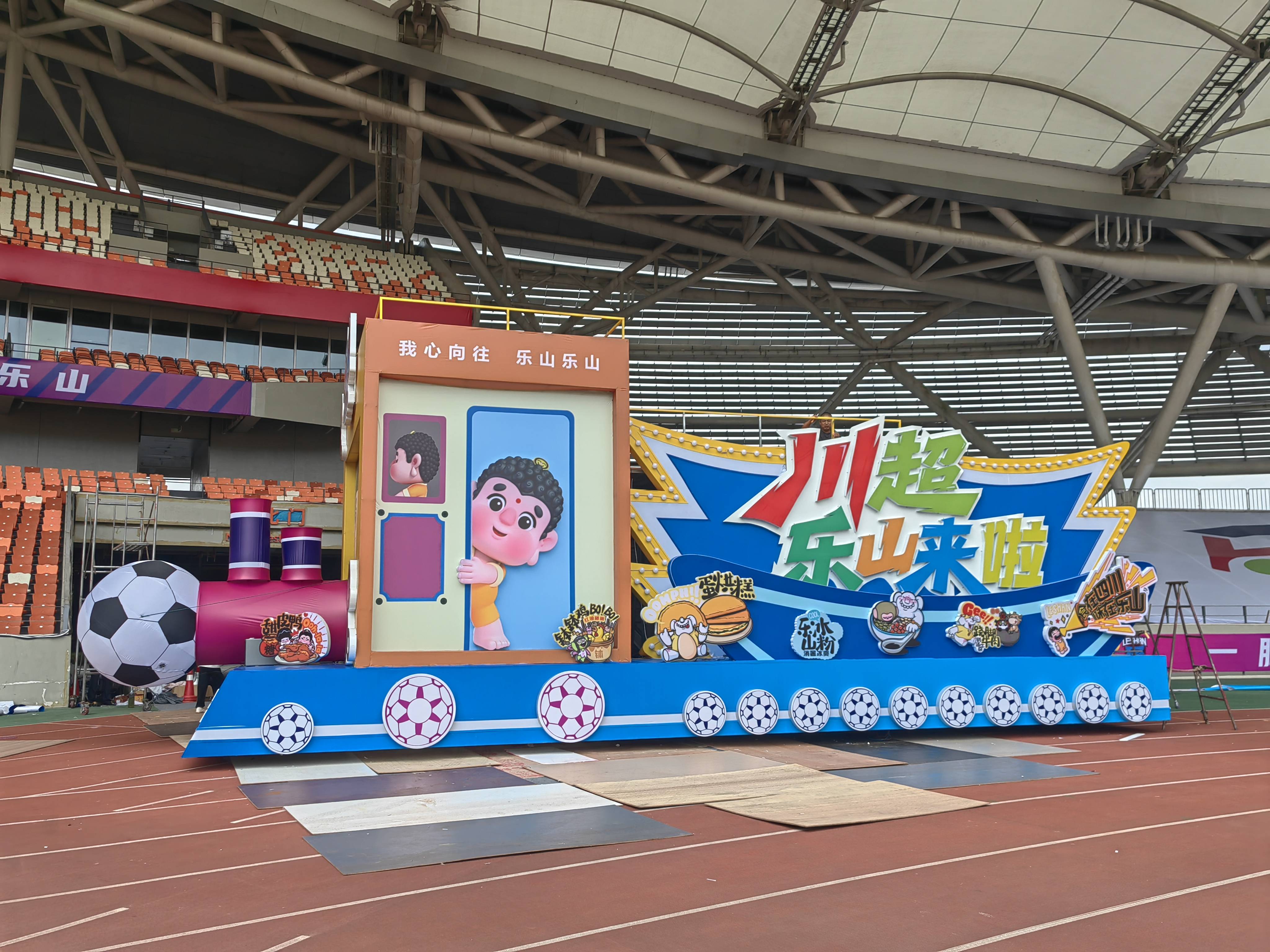 足球场内,文旅展演排练正火热进行。印有川超乐山来了字样的乐山号彩车领航巡游,沐川草龙、啦啦操、舞狮、峨眉武术、街舞天团等节目也进入相当后的排练阶段。