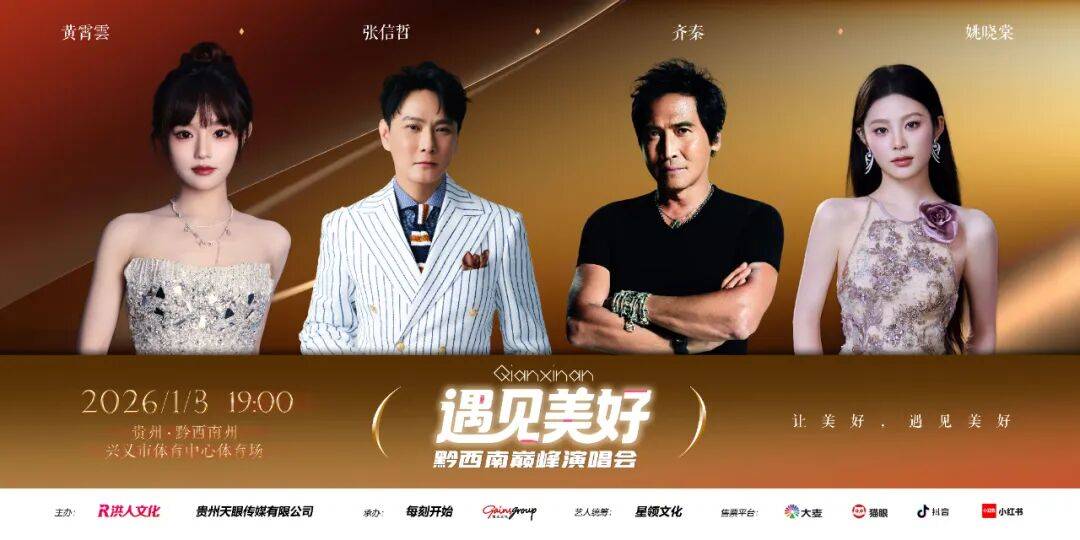 “遇见美好・黔西南巅峰演唱会”将于2026年1月3日19点在兴义市体育中心体育场激情开唱,黄霄雲、齐秦、姚晓棠、张信哲(按拼音首字母排序)四大实力唱将,用经典旋律点亮黔西南夜空,为广大歌迷献上一场山水与音乐交织的视听。