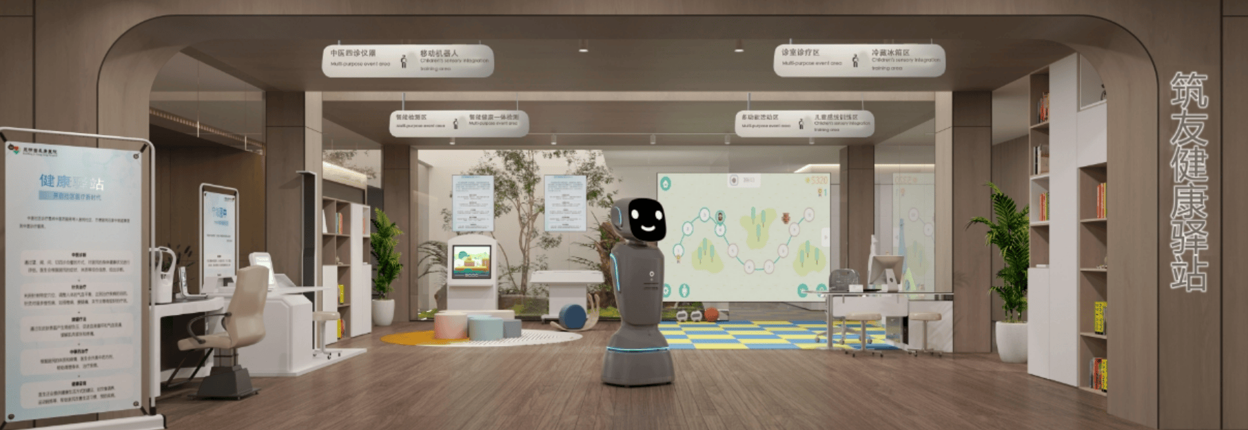 驿站设备:配备有智能健康体检一体机、3D智能体测镜、中医四诊仪、单车康复训练仪、婴幼儿智能体检仪、儿童AR感觉统合运动系统辅助用具等设施设备。健康驿站根据业主购房情况,按户赠送不同程度的健康服务,业主可根据自身实际需求,有针对性进行选择。