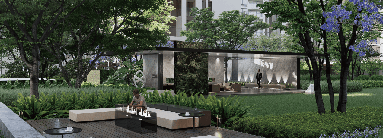 设计亮点:主入口采用水景雕塑+树池阵列+下沉广场,搭配丛生朴树/铁冬青等高大乔木,形成“仪式轴+对景墙”归家动线,兼具度假酒店的尊崇感与私密感。