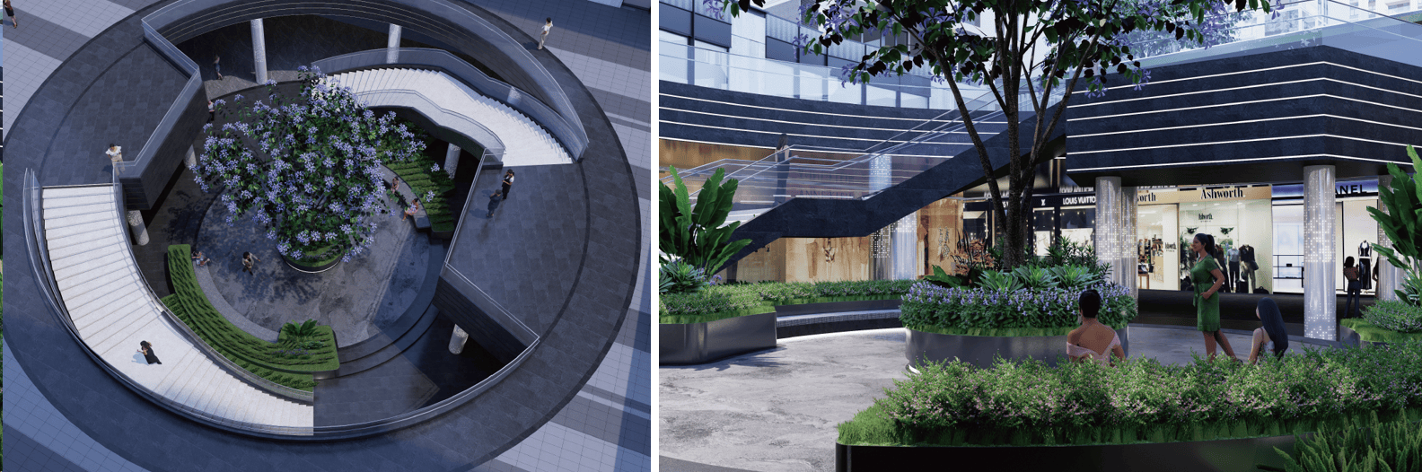 下沉商业广场:社区北向入口,设置下沉商业广场,缤纷商业区或社区配套会所,丰富业主茶余饭后娱乐生活。