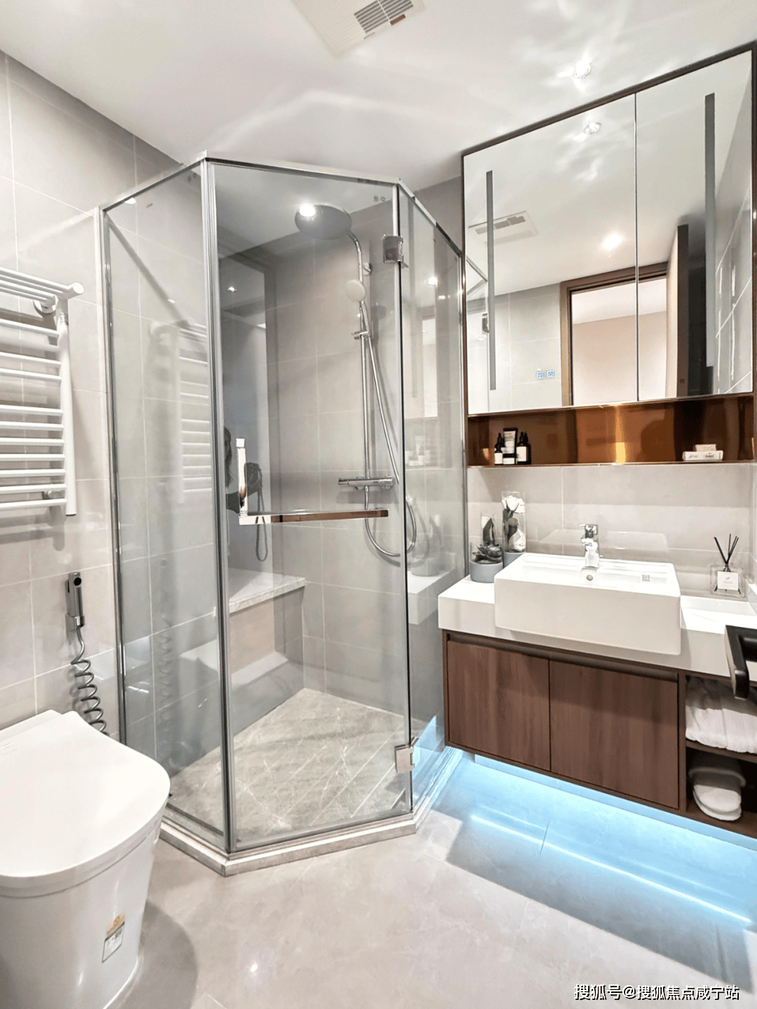 卫浴空间是私享生活的精神领地。建面约145㎡采用双卫设计,并且客卫做到了干湿分离,日常使用,互不干扰;主卫则功能齐配,使得生活用品可以各安其位。除汉斯格雅淋浴、奥普浴霸凉霸等知名品牌配置外,上实·吴淞道1號还特别携手科勒品牌,甄选“女王座”智能马桶,专为女性需求定制,让精装细节成为体贴入微的关照。