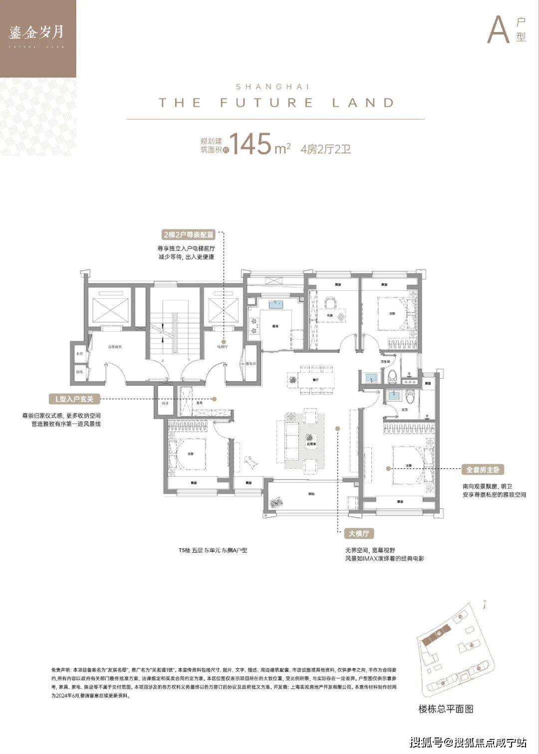 这是一个配置超大横厅+L型入户玄关的奢阔4房户型,同样搭配两梯两户+独立入户电梯厅的设计,不同的是横厅及各功能空间的尺度都进行了一定比例的升级。
