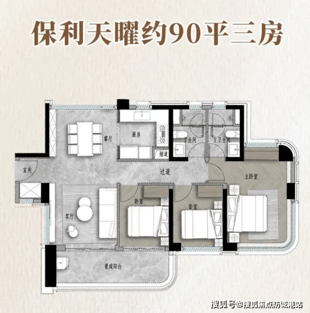 90㎡三房两厅两卫:作为金融城西区稀缺的小户型产品,该户型采用新规设计,阳台占比可达25%,叠加不计容公共开放空间(约10%),实际使用率有望突破120%。南向阳台+主卧飘窗保证全天候采光,动静分区合理,两梯四户配置兼顾效率与成本,是年轻家庭安家天河的高性价比之选。