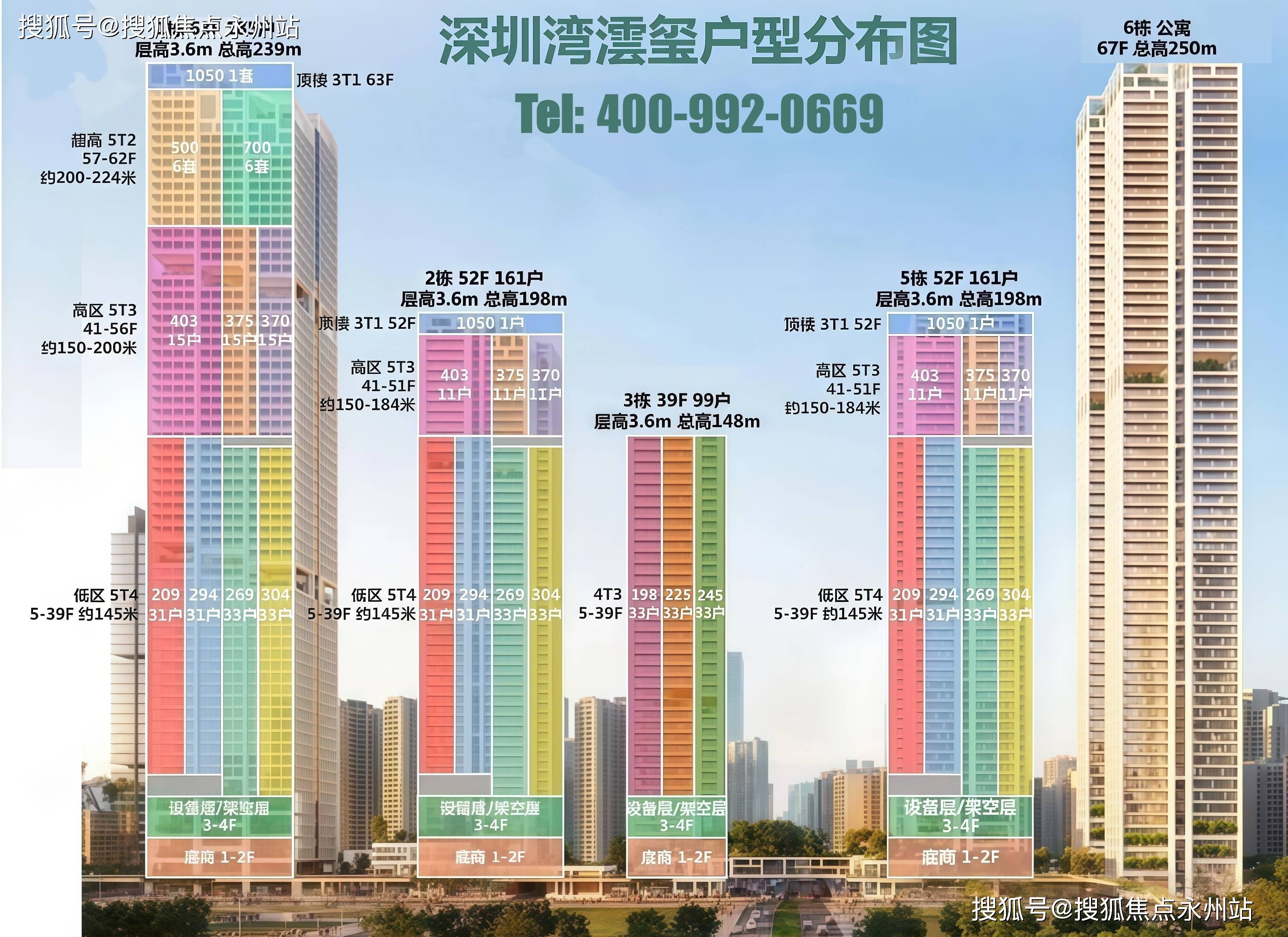 规模:占地3.85万㎡,总建面26.3万㎡,容积率7.59,规划5栋超高层住宅(1栋250米公寓塔楼+4栋150-240米住宅塔楼),可售住宅约601套,主力户型200㎡以上,实用率超92%。(深圳南山深圳湾澐玺售楼处电话:)