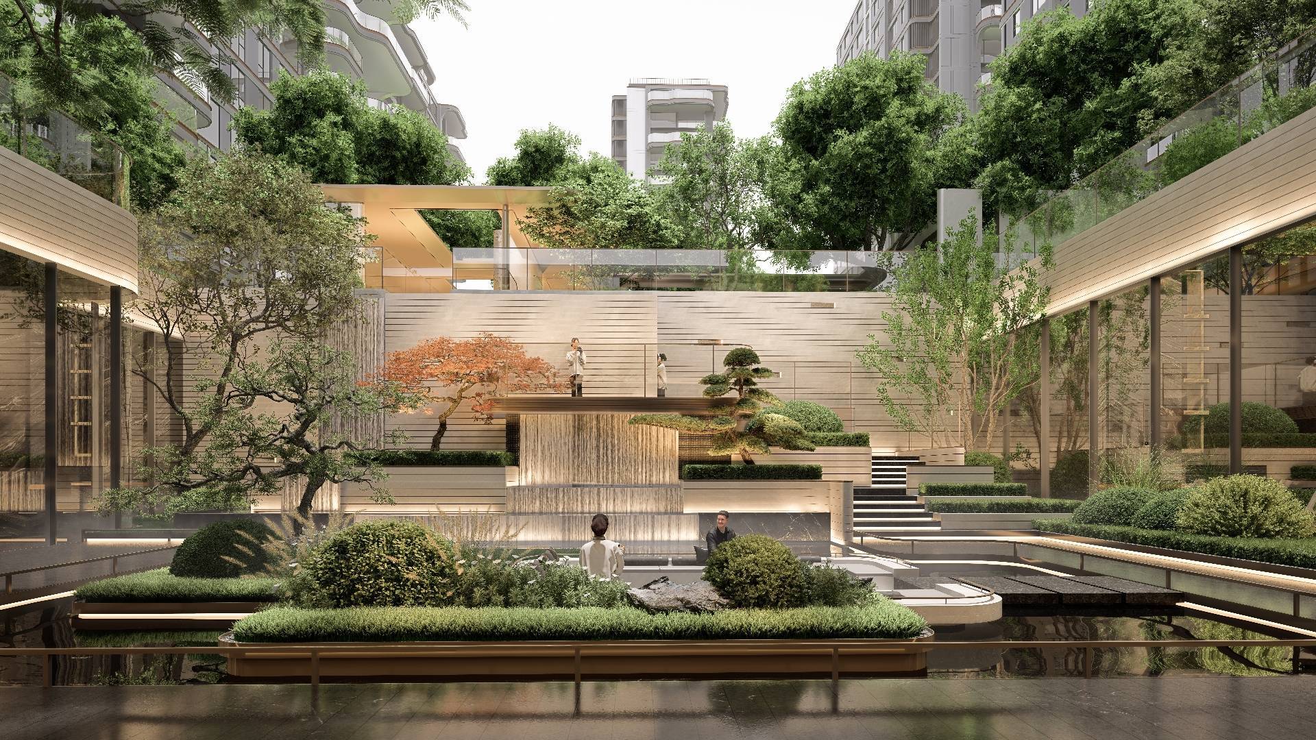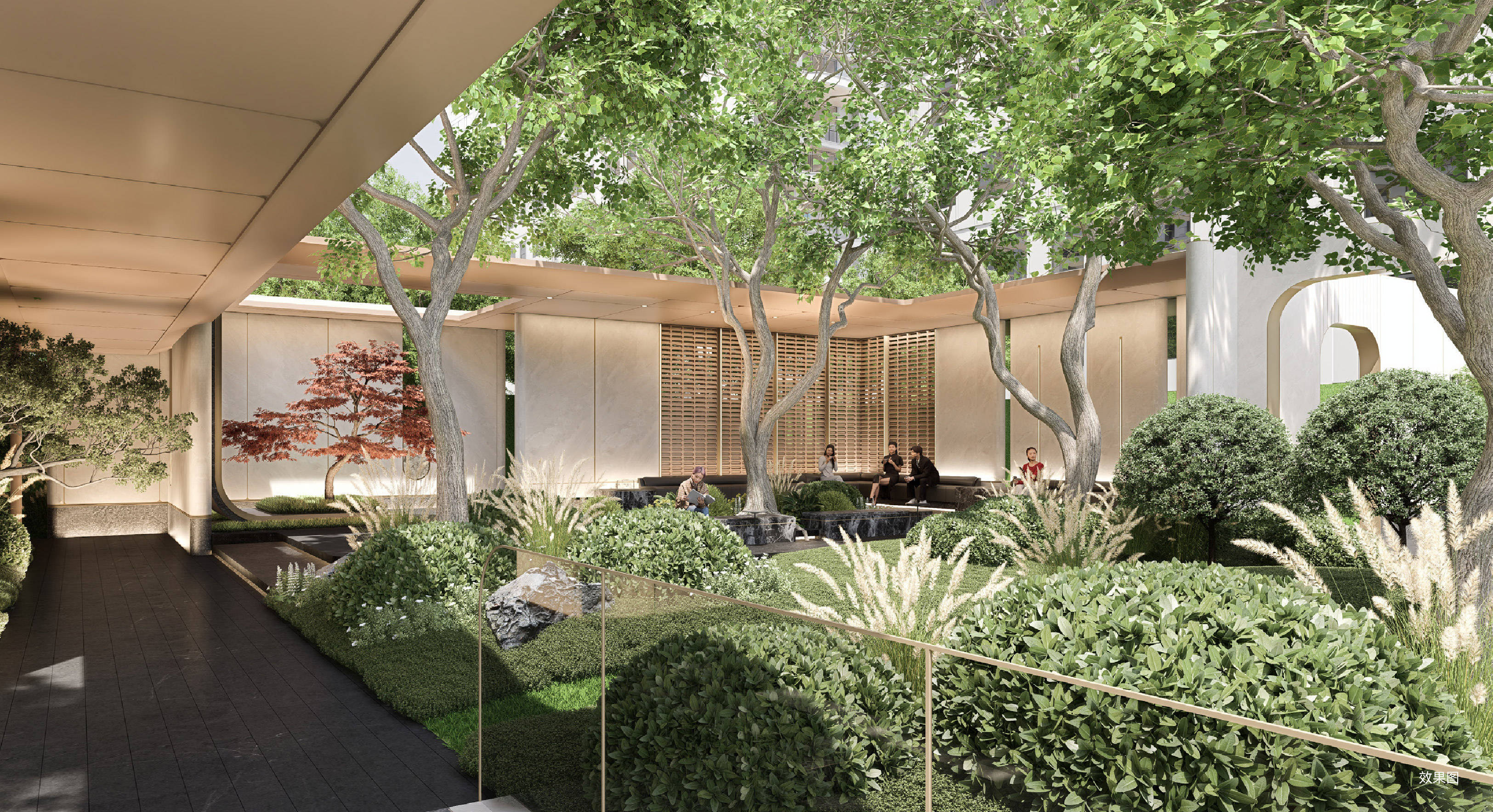 一进艺术馆级入口门庭/二进森奢会客厅/三进立体下沉庭院/四进全景宅间花园/五进精装大堂入户。