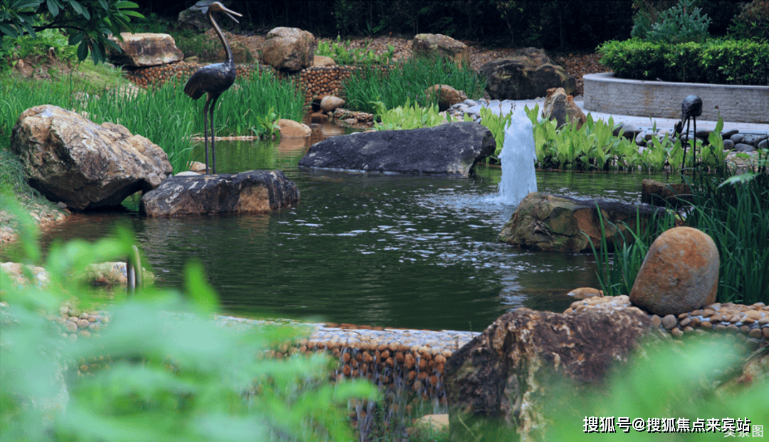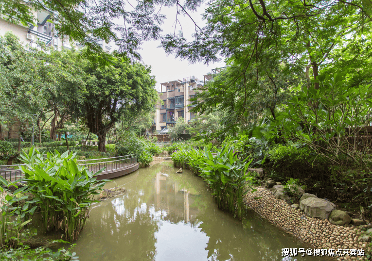 项目内部打造了一条沿着台地蜿蜒的溪流,该水系为市面罕见的活水溪流,贯穿整个社区园林,依据溪岸的曲直不同和地形变化,打造叠水、溪流、瀑布、水潭等多样特色水景,溪岸植物种类繁多,与水流互为风景,沿岸专门设置不同的亲水平台,营造自然灵动的栖心之境。
