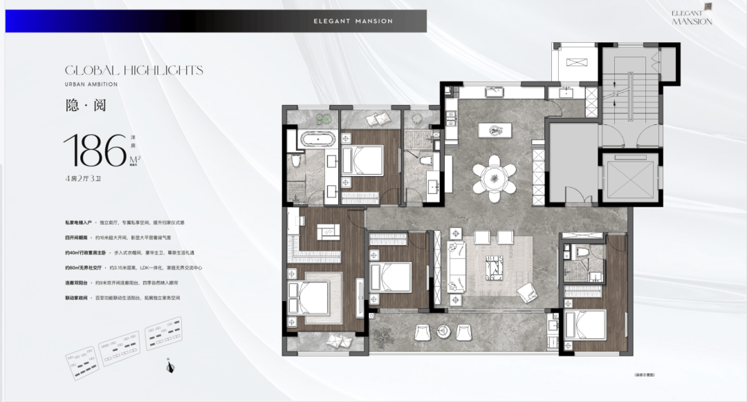 建面约186㎡:约55平的LDK餐客厨一体化空间联动大阳台,视野和互动感极佳。私家电梯入户,配置了分享式中西双厨和独立岛台,宴请聚会都从容。