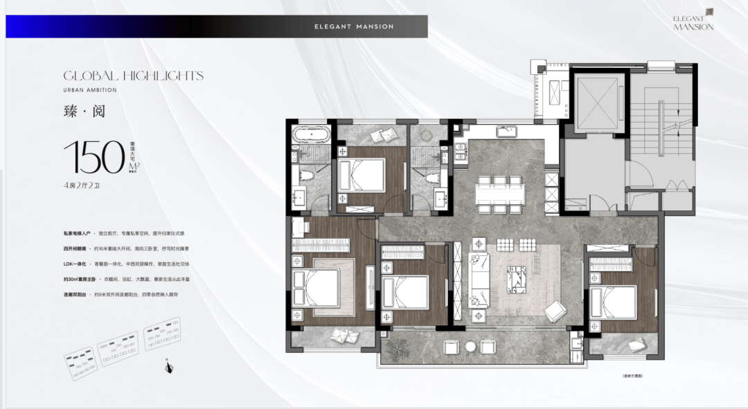 建面约150㎡:拥有超大的横厅和约8.6米长的景观阳台,厨房开间达4.8米,同样是私家电梯入户,尺度非常舒适。