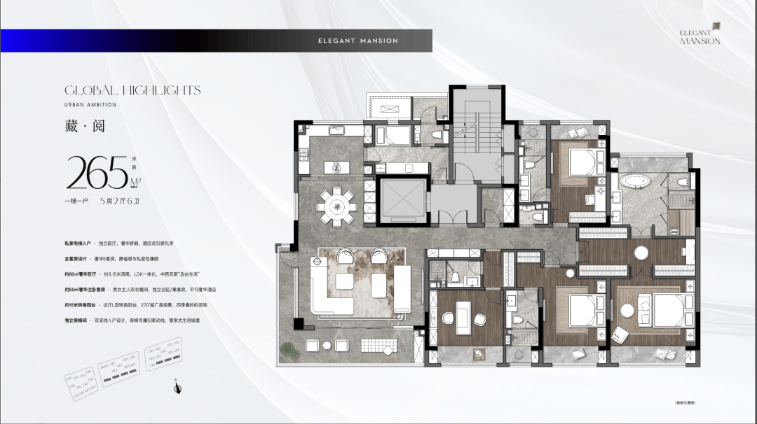 建面约265㎡:一梯一户的绝对私密,270°转角环幕巨厅将湖光山色尽收眼底。五套房设计,兼顾每位家庭成员的独立空间。装修更是极致奢华,配备了SMEG、杜拉维特、汉斯格雅、菲斯曼等一线国际品牌,甚至独享桑拿房,诠释顶级大宅风范。